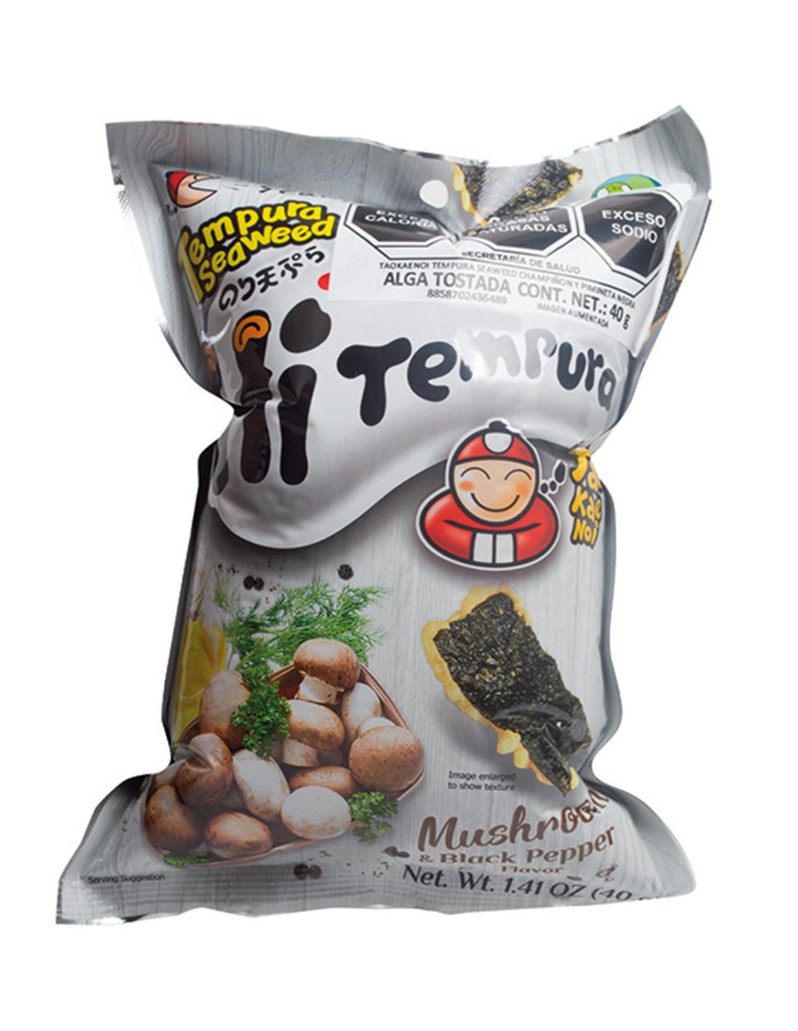 Acerca del producto: Taokaenoi Tempura Seaweed Champiñón y Pimienta Negra combina la textura crujiente del alga nori con los sabores umami de los champiñones y un toque de pimienta negra. Una opción deliciosa para un snack sabroso y diferente.