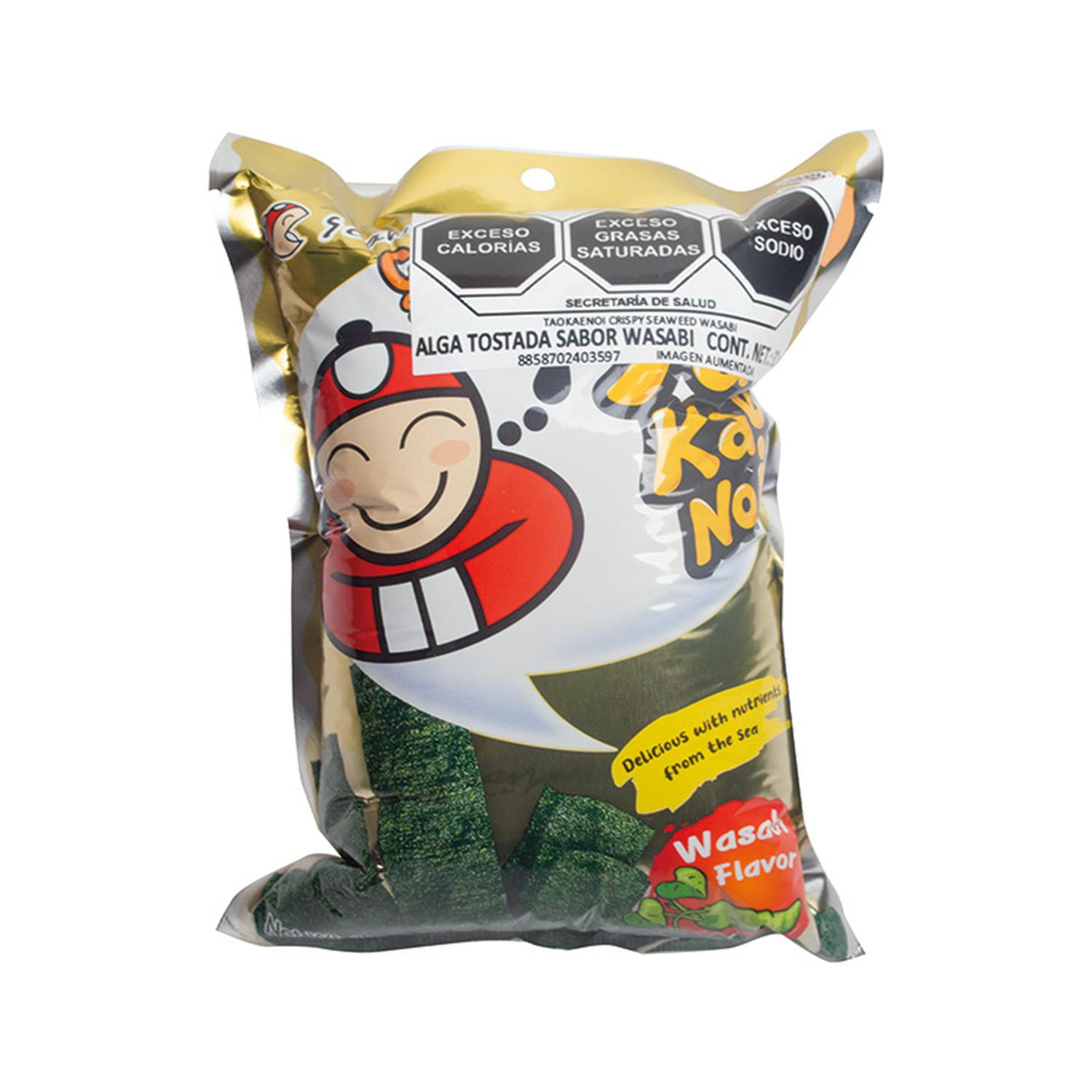 Acerca del producto: Taokaenoi Crispy Seaweed Wasabi es un snack delicioso que combina la crujiente textura del alga nori con el potente sabor picante del wasabi, perfecto para los amantes de los sabores intensos.