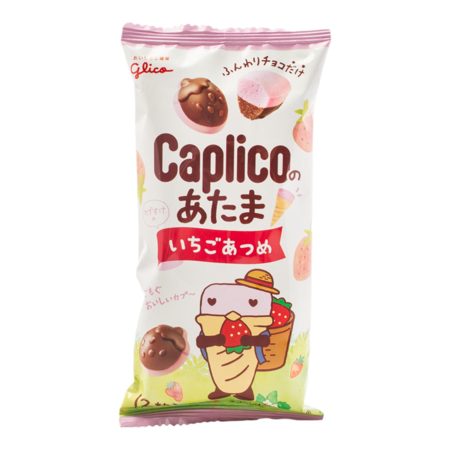 Acerca del producto: Delicioso chocolate japonés Caplico de Glico con un sabor a fresa, presentado en un formato ligero y crujiente.