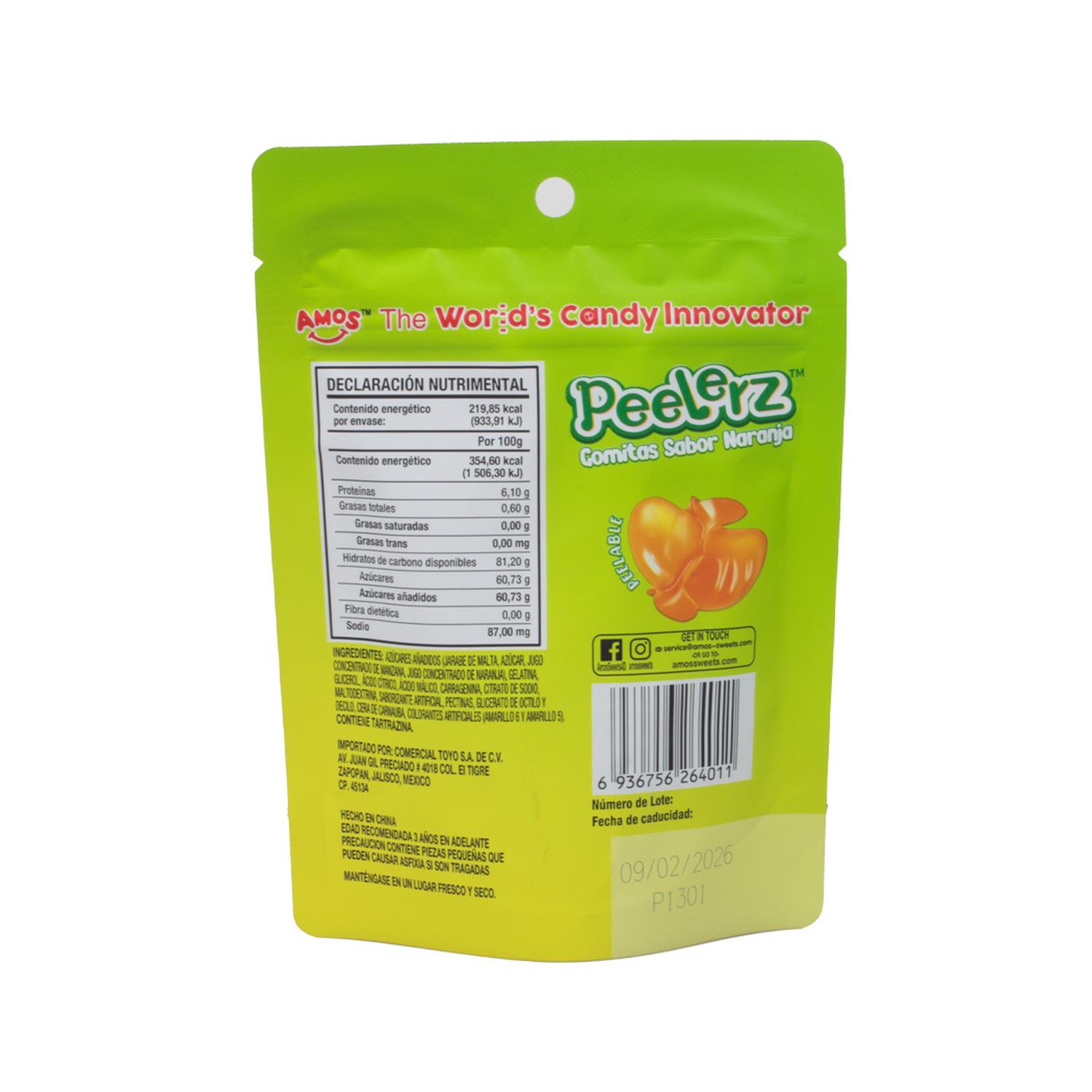 Acerca del producto: Amos Peelerz Naranja son gomitas sabrosas hecho de naranja ideal para quienes buscan algo refrescante y ligeramente ácido.