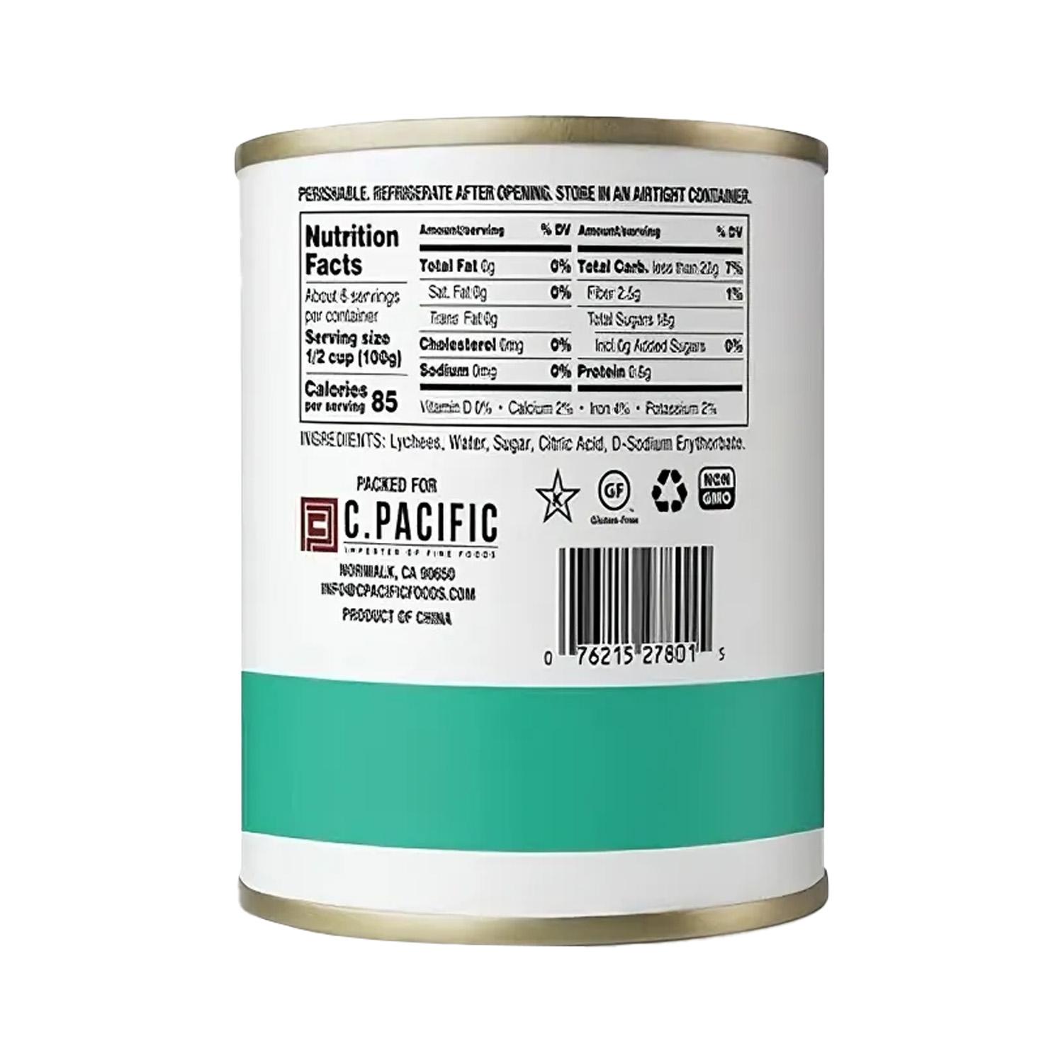 – Ingredientes principales: lichis enteros, agua, edulcorante (sucralosa), ácido cítrico.