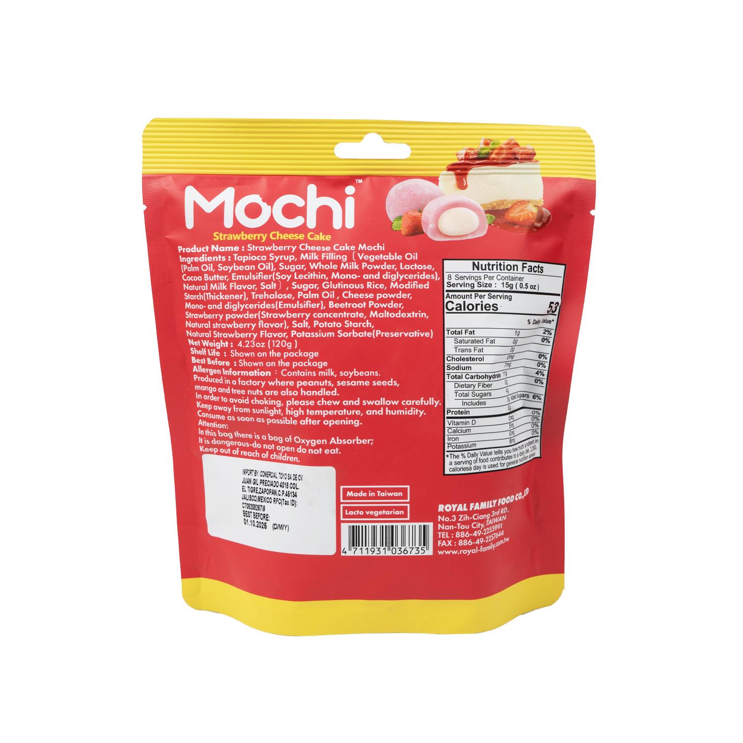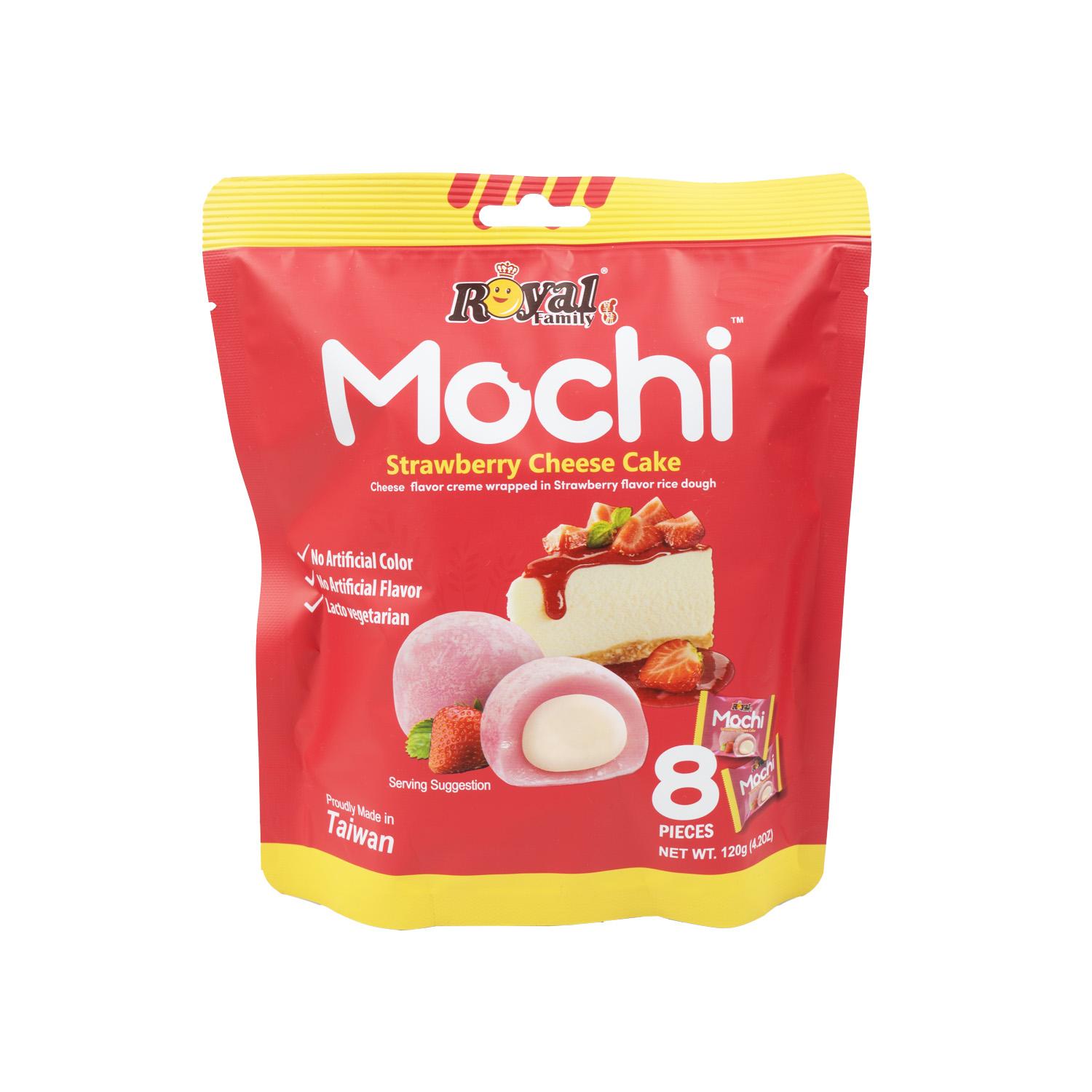 Acerca del producto: El Royal Mochi Pay de Queso con Fresa es una deliciosa variante de mochi que fusiona la textura suave del arroz glutinoso con el cremoso sabor del queso y la frescura de la fresa. Este postre es ideal para quienes buscan un toque de dulzura con un sabor afrutado y cremoso.