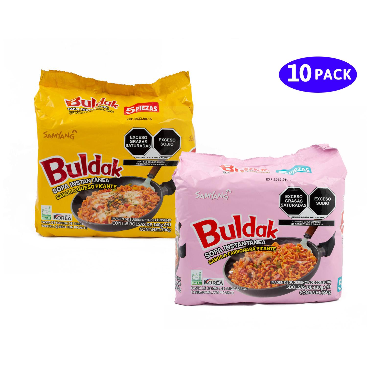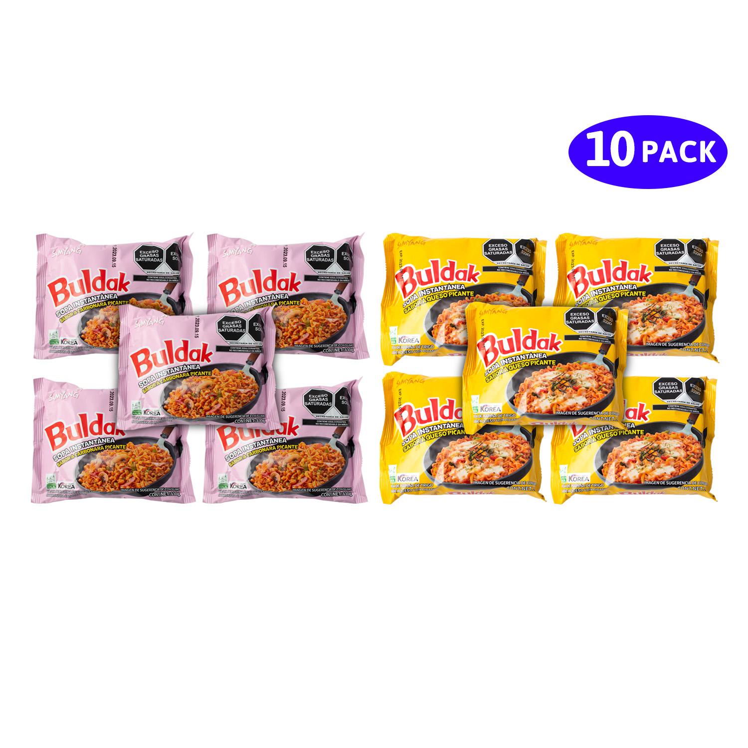 Paquete con 10 ramen instantáneos, 5 sabor hot chicken carbo y 5 hot chicken cheese