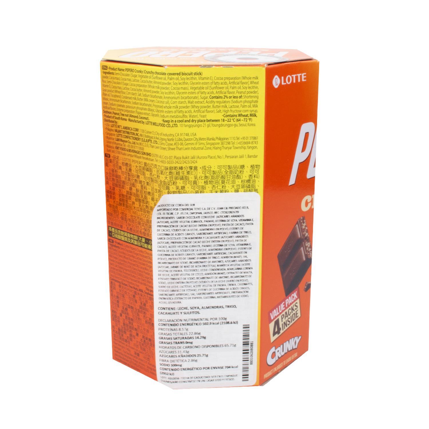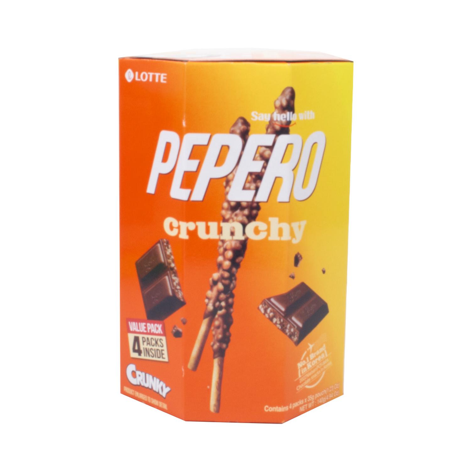 Acerca del producto: Lotte Pepero Crunchy es un snack delicioso en forma de palitos cubiertos con una capa de chocolate y relleno crujiente.