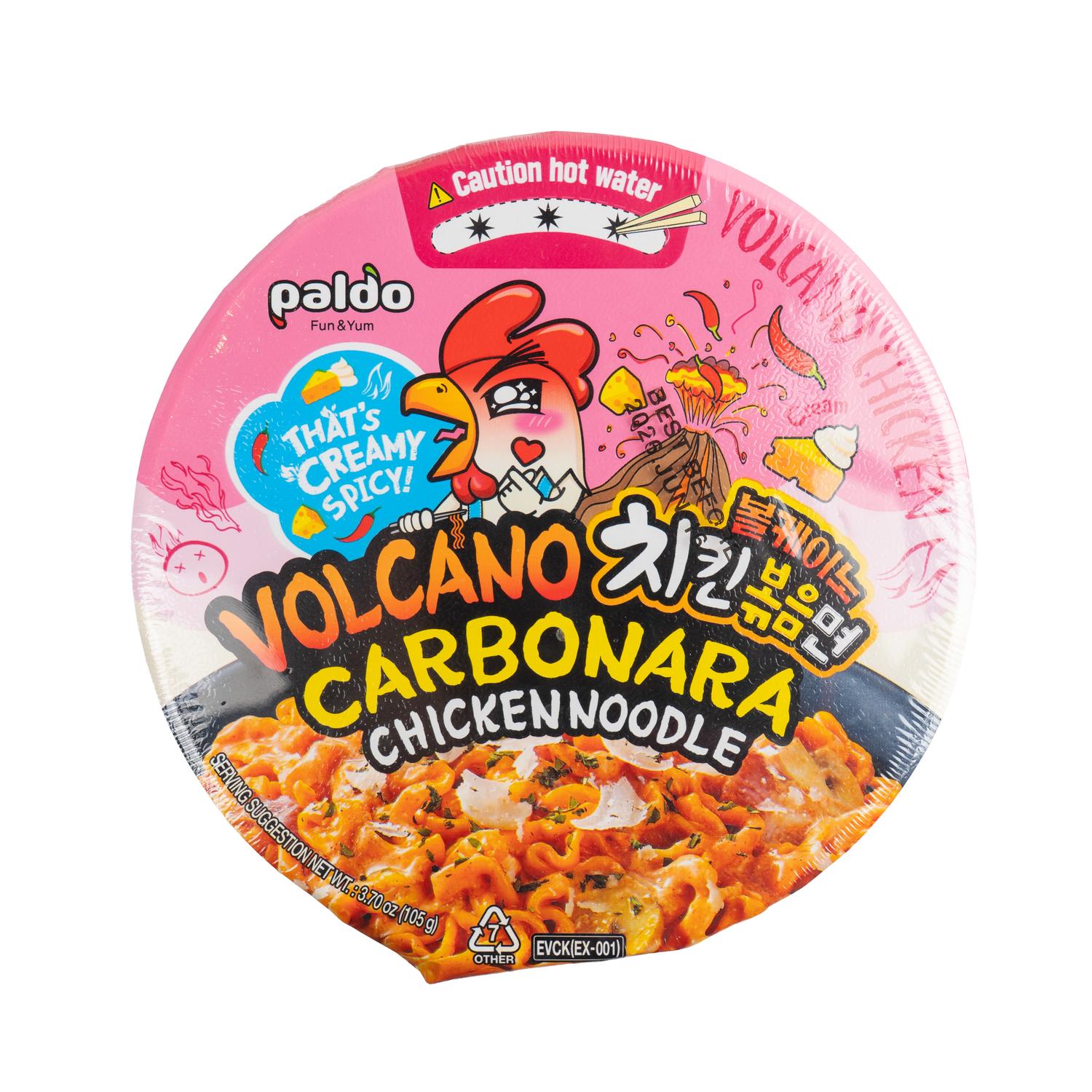 Acerca del producto: Sopa instantánea coreana en vaso grande con sabor Volcano Carbonara. Combinación única de picante extremo con una base cremosa tipo carbonara, ideal para quienes buscan sabores intensos.