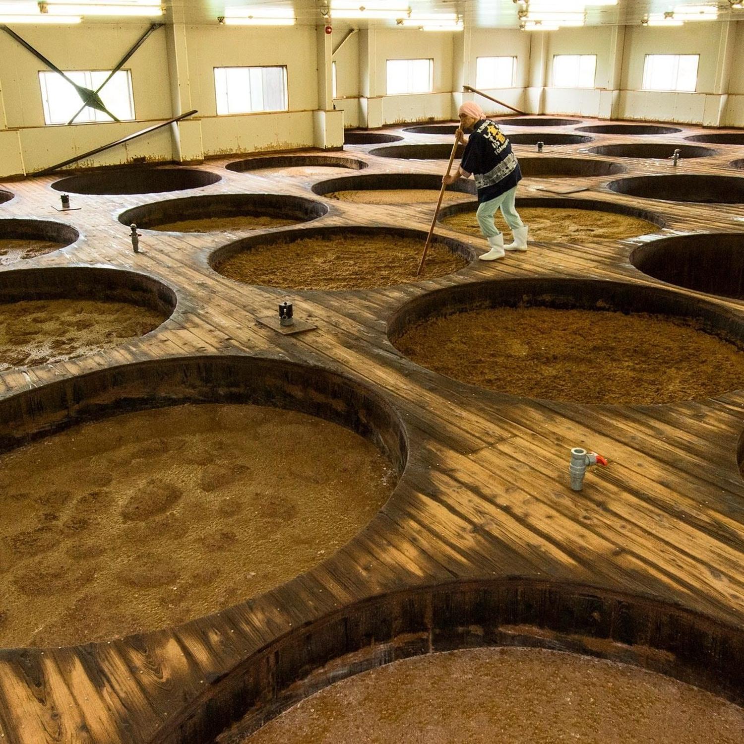 se fermenta y envejece en una gran tina de cedro y los ingredientes únicamente soja integral, trigo y sal secada al sol.