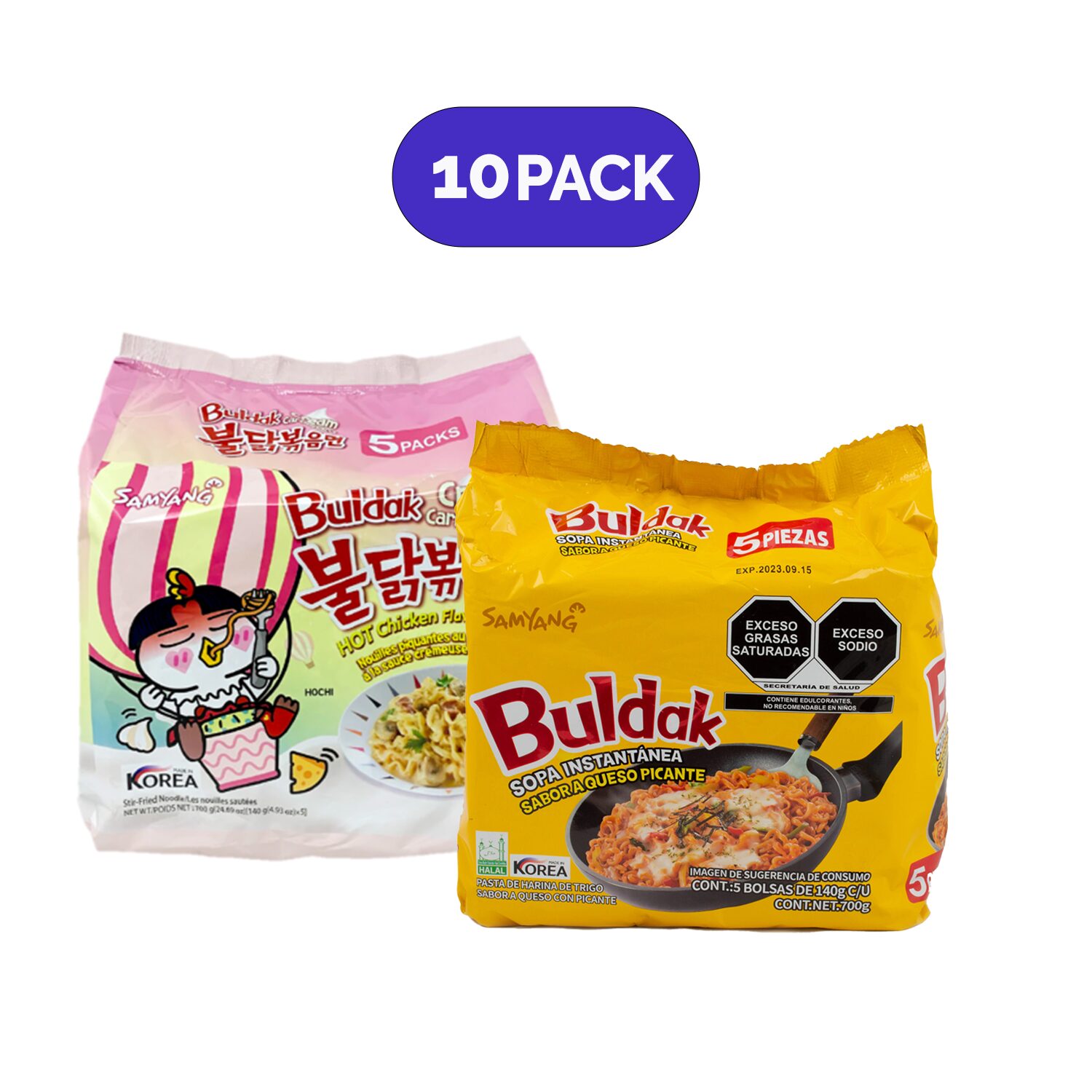 Paquete con 5 ramen hot chicken creamy y 5 chicken cheese