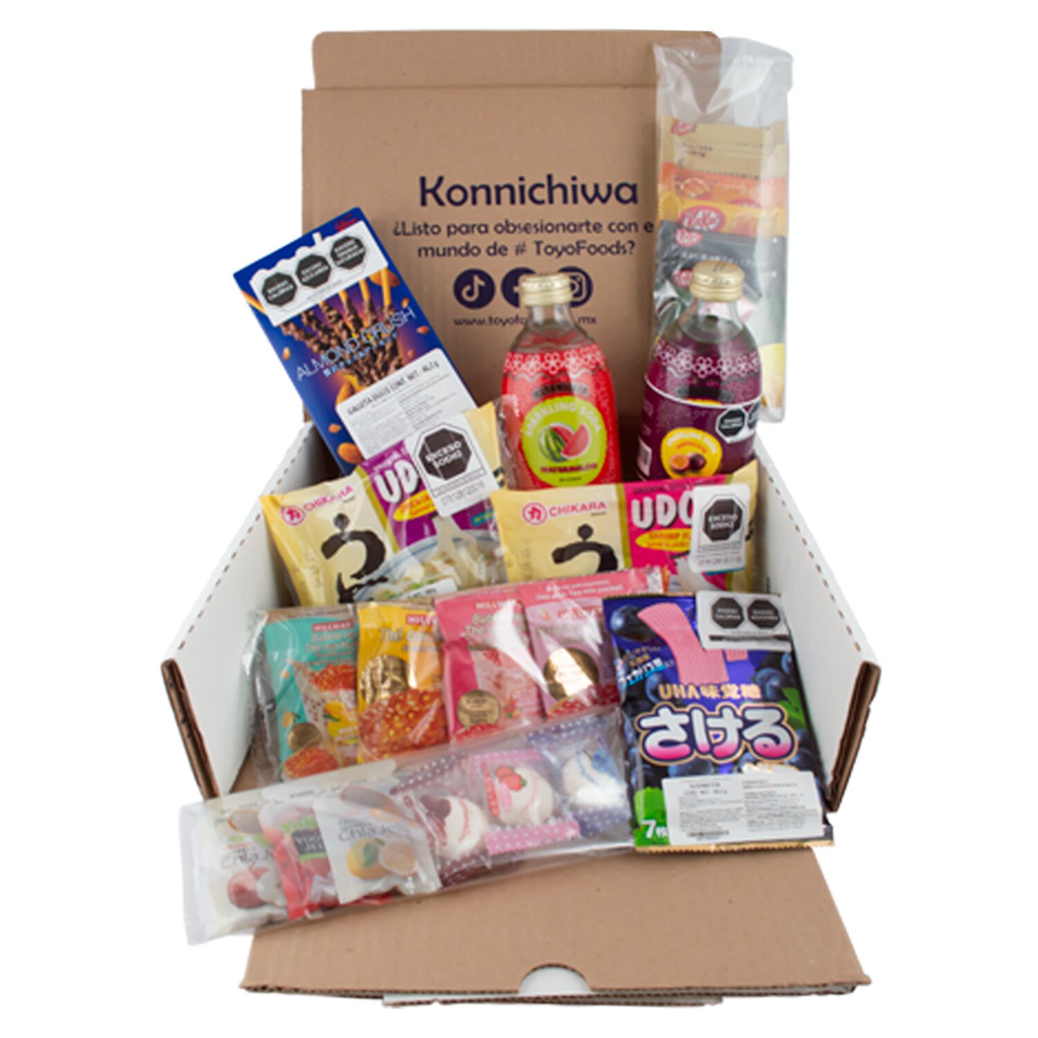 Caja sorpresa con durtido de dulces y botanas japonesas y coreanas
